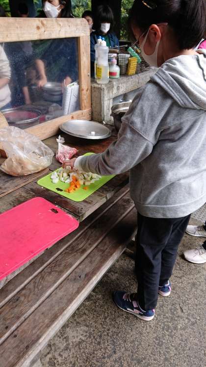 お米を研ぐのも初めての人がたくさんいました。野菜の切り方も教わりながら頑張っています。かまどに火も付きました。いよいよ煮込んでいきます。