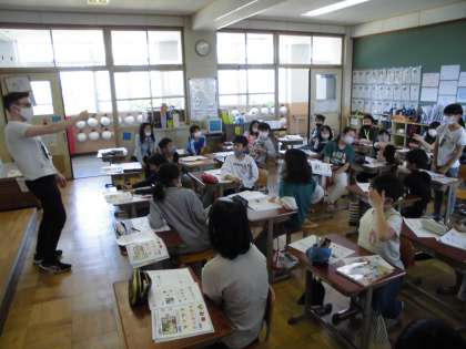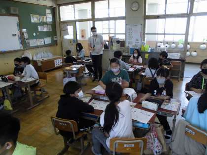 5年生の外国語で,ALTのデロン先生と学習をしました。相手の好きなものをたずねたり,自分の好きなものを答えたりする言い方をたくさん言い合いました。