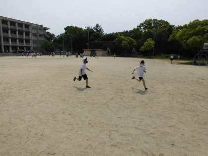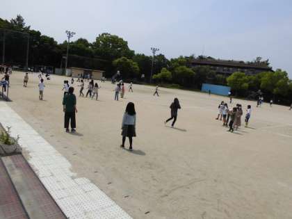 木曜日はロング昼休みの日です。遊び係の人が,みんな遊びを企画してくれました。この日は,1組はドッジボール,2組はバナナおにでした。みんなで元気に遊びました。