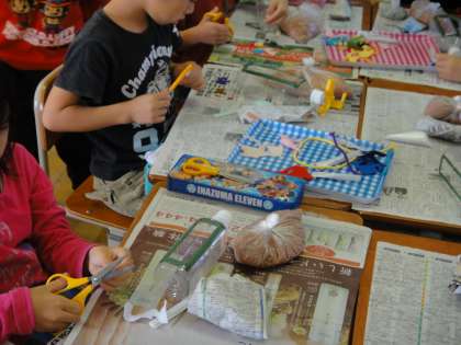 はじめに,生活科室で花育の紙芝居をみて,お花のことを勉強しました。その後,教室に戻り,ペットボトルに飾り付けをし,そのあと寄せ植え用の砂を入れて,多肉植物を上手に植えていきました。