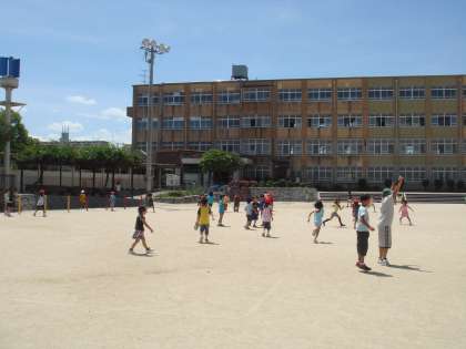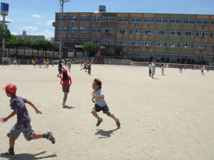 広い運動場を力いっぱい走って逃げようとする子や物陰に潜んで見つからないようにする子など,鬼ごっこをしても子どもたちの性格が表れています。梅雨明け空の下,元気いっぱいに遊んでいました。