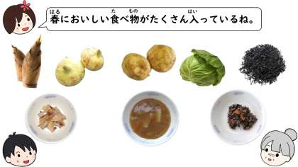 今日は5月のなごみ献立です。春においしい食材をいろいろ使っています。ひじきを牛肉や野菜と炒めて甘辛く,「牛肉とひじきの炒め煮」。たけのこを使った「たけのこのおかか煮」。新じゃが・新玉・春キャベツを使った「春野菜のみそ汁」。