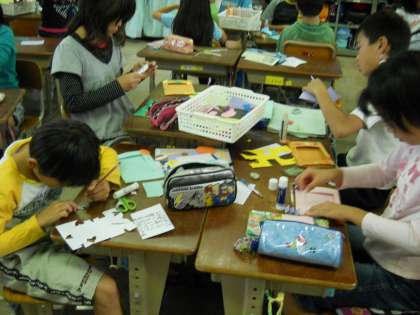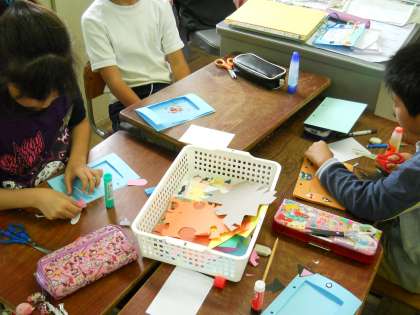 4年生は写真たてにもなるメッセージカードを作ります。子どもたちは画用紙で思い思いにメッセージカードを飾り,見守り隊の方々が喜んでいる姿を想像しながら作りました。