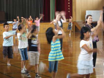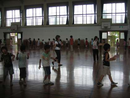 今年の運動会でも,2年生児童は「美豆音頭」を披露しました。8月に行われる「淀南夏祭り」においても,美豆音頭を踊られます。小学校でも数年前から気軽に参加できるようにと,地域婦人会の皆さんのご指導で練習をしています。今日は,ALTのサラさんも踊りの輪の中に入ってもらいまた。