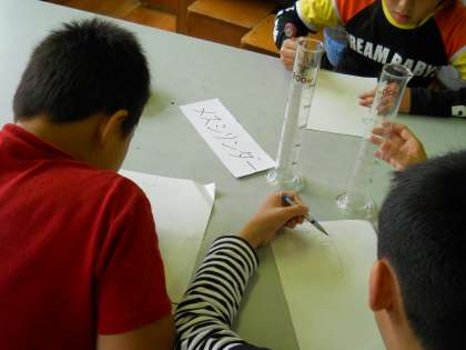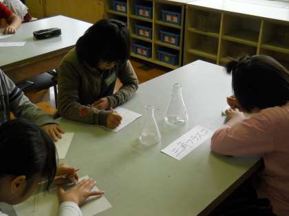 メスシリンダー,集気びんなどマイナーなものまで,子どもたちは物珍しそうに絵に描き,名前を覚えていました。
