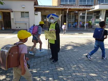 子ども達が給食を楽しくおいしく食べられるようにと,その日の献立を模したいで立ちで子どもたちを迎えているのです。