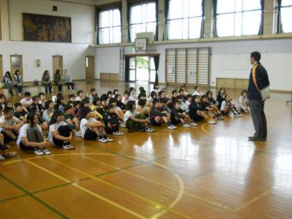 体育でリズムダンスの発表会を行いました。今日の本番を迎えるまで,各班が熱心に練習に取り組むことができていました。その成果を発表する時が迫っています。会の進行にあたり,始めに校長先生の話を聞いています。。