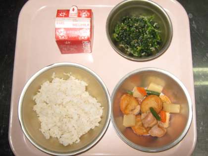 今日の給食は,『麦ごはん・牛乳・平天とこんにゃくの煮つけ・ほうれん草とじゃこのいためもの』です。