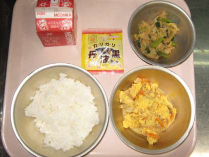 今日の献立は,『ごはん・牛乳・あげたま煮・ほうれん草のごま煮・黒大豆(かりかり)でした。
