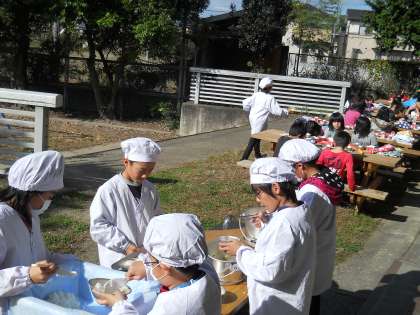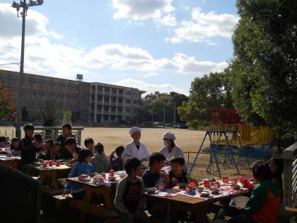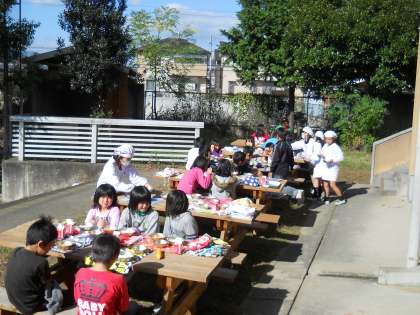 秋晴れの下,食べる給食は格別!子どもたちもピクニック気分です。