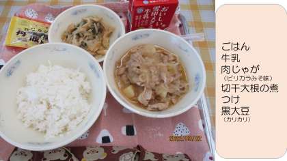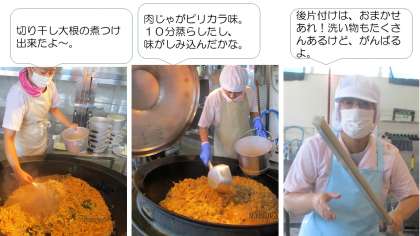 朝晩はちょっと涼しくなってきましたが、給食室は今日も35度の室温。「やっぱり暑いな〜」と言いながら、今日も給食調理員さんはおいしい給食を一所懸命作ってくださいました。子どもたちの感想では、「じゃがいもがホクホクしておいしかった」「だしの味がした」など書いていました。