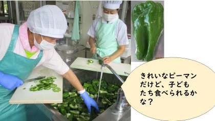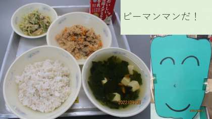 今日の献立は、麦ごはん・牛乳・おからツナ丼(具)・鶏肉とピーマンのごまいため・すまし汁です。夏野菜のピーマンともそろそろお別れです。鶏肉とキャベツ・ピーマンを炒め、ごまを加えて仕上げます。ピーマンは苦さもあるけど、どうかな?ピーマンマンの応援で、1〜2年生もたくさん食べられました。「ごはんと食べたらおいしい」「苦くないよ!」と感想を聞かせてくれました。