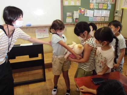 また、3kgある赤ちゃん人形を一人ずつ抱いて、意外に重かったり軽かったり驚きながら重さを感じていました。