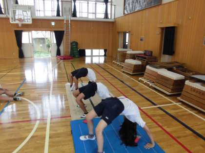 初めのころと比べて、授業の初めに行う背倒立やブリッジなども上達してきました。ねらい1では、今できる技の完成度を高めるよう友達と技を見合って教えあってきました。ねらい2では、それぞれの場でできる技を増やせるように何度も挑戦する姿が見られました。終わってみると、もっとやりたいという子が多く、6年生でも頑張ってできる技を増やしてほしいと思います。