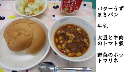 今日の献立は、バターうずまきパン・牛乳・大豆と牛肉のトマト煮・野菜のホットマリネです。大豆は固い大豆を朝からコトコトゆでて柔らかくしてから炒めた牛肉や野菜と合体します。野菜のホットマリネは、蒸したじゃがいも・キャベツ・にんじんをオリーブオイルで炒めてりんご酢・さとう・塩・こしょうで味つけします。