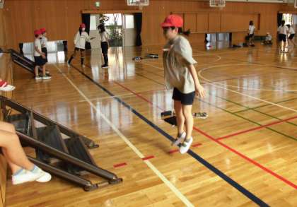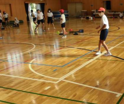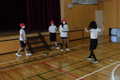 体育科の学習で、「しぜんのいりょく」の学習に取り組んでいます。自然の威力が感じられるように体全部を使って表現をします。曲に合わせて一人で表現した様子をビデオでとって、自分の動きを確かめていました。友達と確認しあう中で新しい動き方を生み出し、楽しみながら学習を進めていました。