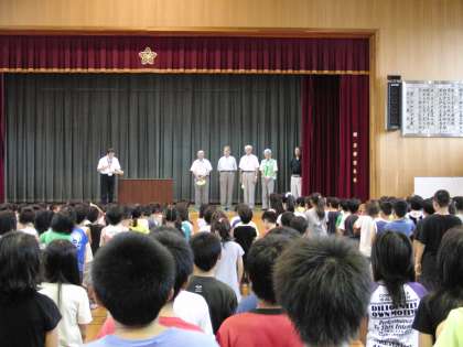 朝会がありました。地域の見守り隊の皆さんへの感謝状をお渡ししました。毎朝登校の安全を見守っていただいている「PTA旗当番」の方々と,下校時に見守っていただいている「淀南子ども見守り隊」と「八幡長樋見守り隊」の皆様方に来ていただきました。また,学習のボランティアの方々には表彰状をお渡ししました。地域の浮田様ご夫妻には「4年生の国際理解」,淀南婦人会の皆様には「2年生の美豆音頭」,社会福祉協議会の皆様には「5年生の稲作」をそれぞれお世話になっています。