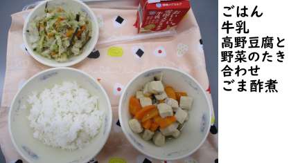 今日の献立は、ごはん・牛乳・高野豆腐と野菜のたき合わせ・ごま酢煮です。ランチルームで、けずりぶしのだしがきいた高野豆腐と汁を味わいながら、「うんうん」とうなずきながら食べている5年1組男子。きっと、「おいしい。うんうん。」と思いながら食べていたのでしょう。そして、ごま酢煮は、しらすぼし入り。最近は漁獲量の加減でめっきり使える量が減ったのですが、細切り昆布プラス、しらすぼしが入っていることで更においしさが増します。5年1組は完食!素晴らしい。