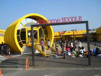 三重県久居市の「おやつカンパニー」に到着しました。広大な敷地に黄色を基調とした工場が並んでいます。見学前の様子です。子ども達は張り切っています!