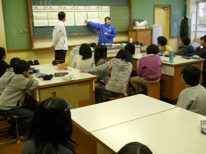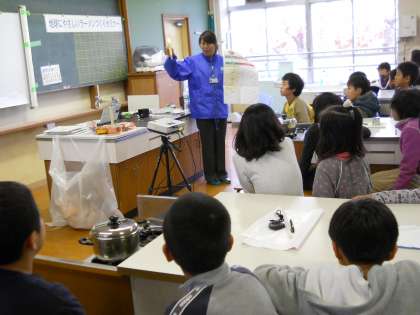 「地球にやさしいラーメンづくりセミナー」と題して,大阪ガスより出前授業に来ていただきました。子どもたちの好きなインスタントラーメン作りを通して,食に関わる環境問題を身近に捉えることが目的です。講師の先生の丁寧な解説に聞き入っています。
