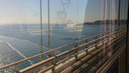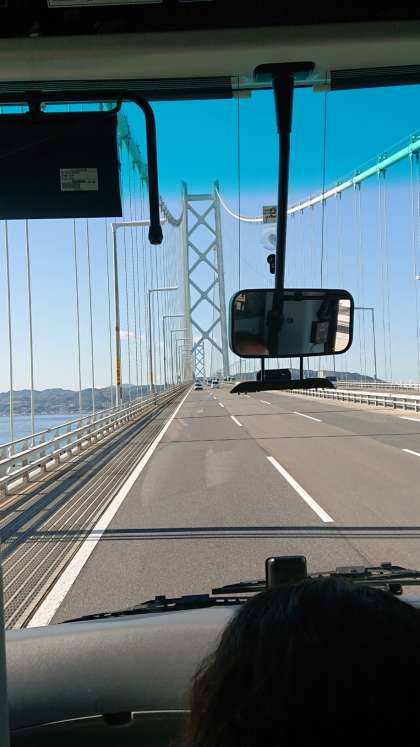 明石海峡大橋を渡っています。最高の景色にみんな見入っています。この後、パーキングに停まって、ゆっくり眺めます。
