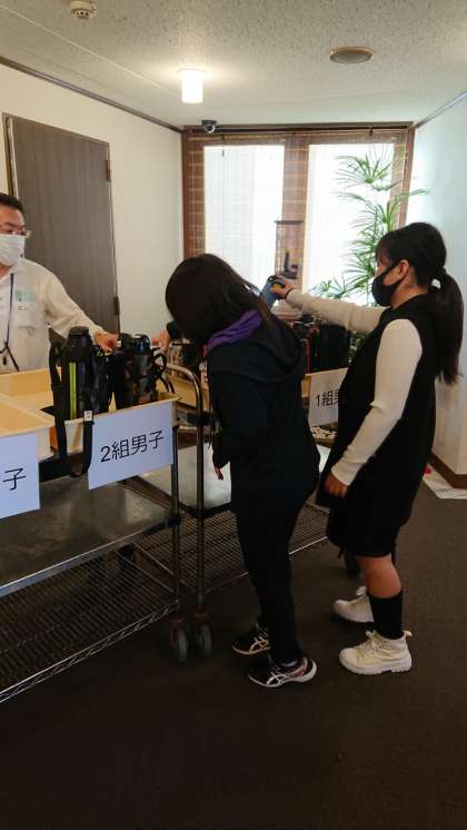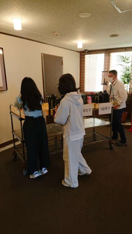 朝食の時には自分の水筒を洗って持ってきます。宿の方が今日のお茶を水筒に入れてくださいます。元気に活動しましょう。