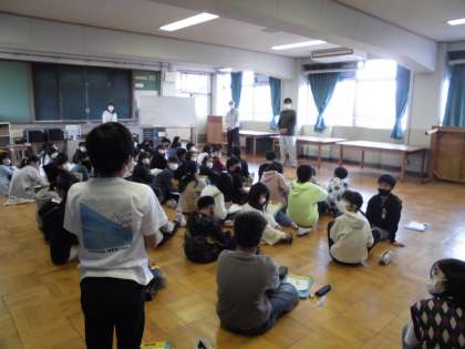 これまでに稲を生長させるためにどのようなことをされてきたのかということや、稲刈りの注意事項などを話していただいた後、子ども達からもたくさんの質問をしました。稲刈りに向けて気持ちが高まった子ども達でした。