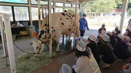 淡路牧場に着きました。クラス写真を撮った後は、乳搾り体験です。大きな牛さんの迫力に圧倒されます。うまく出きるでしょうか。