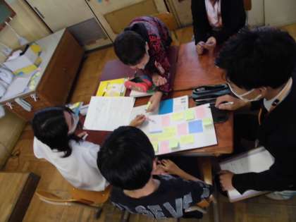 5年生の国語の学習で、よりよい学校生活のためにという単元で、小グループで一人ひとりが考えを出し合い、意見をまとめるという学習を行いました。学校生活がよりよくなるようなテーマを設定し、それぞれのグループでふせんを使って意見を出し合い、説得力が出るように考えを練り上げて発表しました。