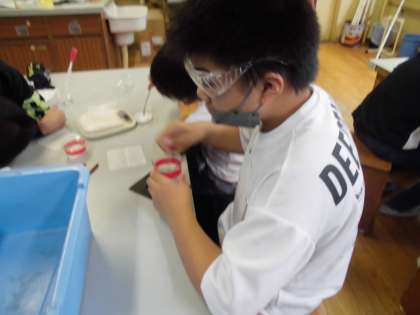 理科の学習で、もののとけ方の実験が進んでいます。この日は食塩とミョウバンのとける様子を観察しました。ものによってとける量が違うことが分かりました。この後、温度が変わるととけ方は変わるのか、とけたものはどこに行ったのかなど、実験をする中で新たな疑問も出てきました。