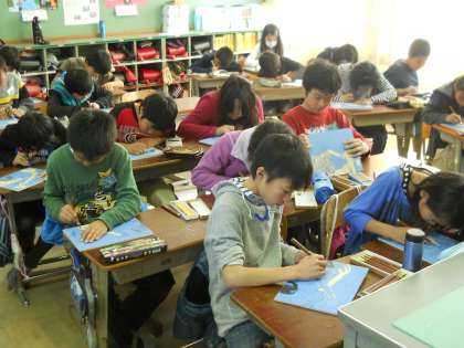 いよいよ彫りも終盤をむかえました。曲線部分は小丸刀,服のしわ等の鋭さを表現したい部分には三角刀を用いるなど,彫刻刀を使い分けています。あくまで完成品は木版ではなく黒色で刷られた和紙にあります。それを念頭に・・・,刷るのが楽しみです。