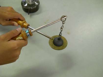 金属の玉を熱したり冷やしたりして体積の変化を調べます。