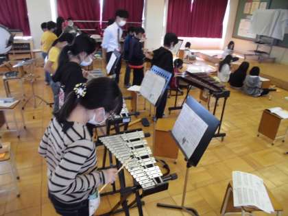 5年生の音楽の学習で、キリマンジャロの合奏に取り組んでいます。リコーダーやオルガン、バスマスター、木琴、鉄筋、打楽器に分かれてパーと練習を行い、音合わせをします。