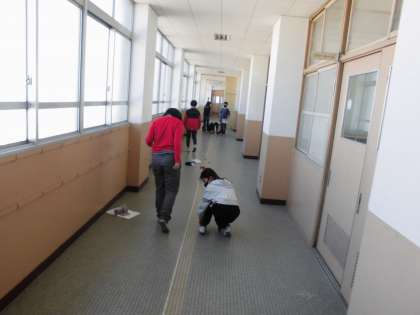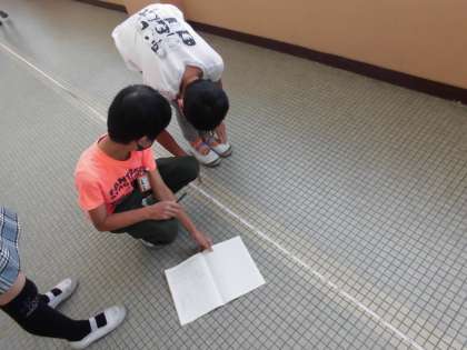 算数の学習で平均を利用して、自分の歩幅を求めました。10歩の距離を5回測ってその平均を求め、1歩の歩幅を求めました。測るとなると緊張してか歩幅が1mほどずれる人もいましたが、調べた10歩の距離の平均を求めるときも、スムーズに求められるようになっていました。
