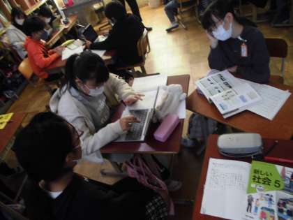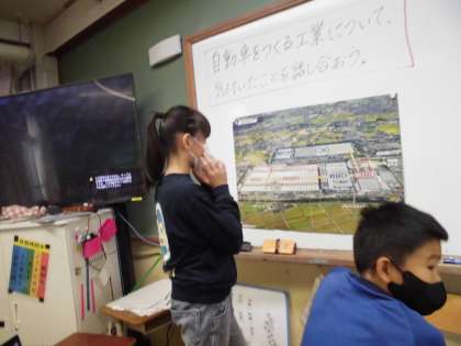 社会科の「自動車を作る工業」の学習で、自分たちで見つけた疑問に対する調べ学習を行っています。自動車はどのように作られているのか、材料はどこから来ているのか、生産台数が増えたのはなぜか、売られるまでにどのような作業があるのかなど、興味のあるテーマについて調べています。それぞれのグループから調べたことを発表しあい、全体で理解を深めていく予定です。