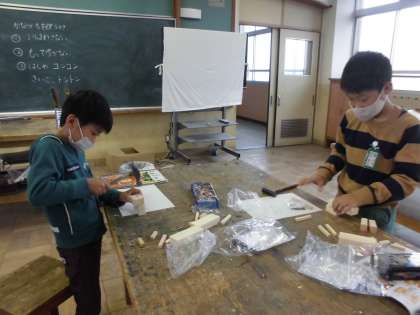 図工で木材にくぎを打ち、イメージした形(生き物やすきな物)を作っています。次回は色をつけていきます。