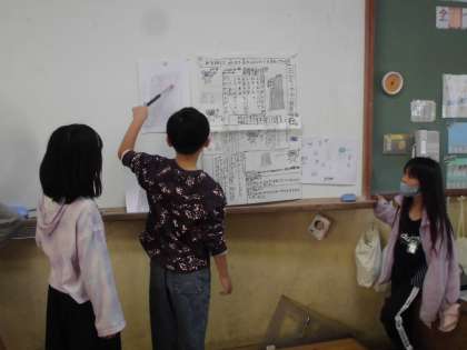 総合的な学習の時間に自分たちで調べたり、地域の方に教えてもらったことをグループごとに新聞にまとめています。