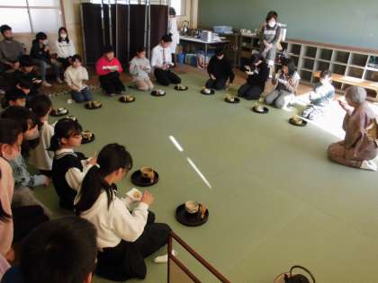 いよいよ一人ひとりにお盆を用意していただき、まずはお菓子をいただきます。この日のお菓子は「さざんか」をイメージした和菓子でした。彩や細かいところまで丁寧に作られた形を見て、子ども達も十分に目で味わうことができたようでした。初めて和菓子をいただくという子も多く、とても貴重な経験となりました。