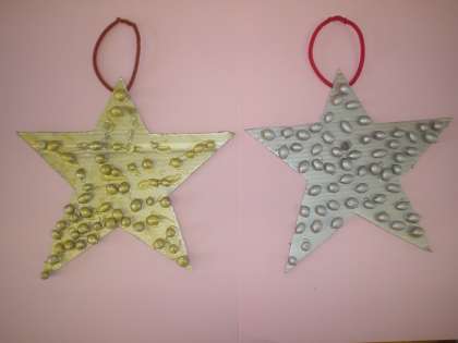 先日木の実で飾り付けたリースに,スプレーで金色や銀色の色をつけました。