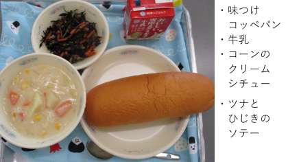 今日の献立は、味つけコッペパン・牛乳・コーンのクリームシチュー・ツナとひじきのソテーです。とろっとしたクリームシチューは、ホワイトルーの手作りです。今日は、飛行機型のにんじんが入っていましたよ。給食調理員さんが型を抜いてくださっています。