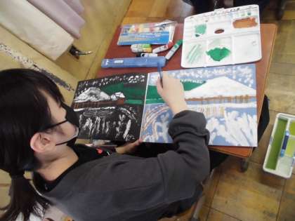 図画工作科の学習で、多色刷り版画の学習に取り組んでいます。自分が美しいと思う風景を調べて下書きをし、線彫りをした後、色を付けていきます。何色か重ねていくうちに、だんだんと仕上がりのイメージに近づいてきたようで、楽しみながら丁寧に作業を進めていました。