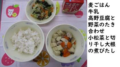 今日の献立は二つのおかずとも、けずりぶしのだしで作られていて、だしのうま味が味わえます。給食でもだしのうま味を使って様々な献立を作っています。
