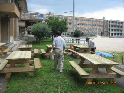 教職員によって,美豆ふれあい広場「かまどらんど」のウッドデッキやテーブルを,防腐剤で加工しました。もちろん人体に影響のない塗料です。明日からのキャンプで活躍してもらいます。