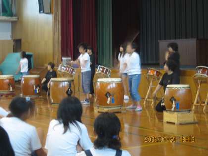 7月25日土曜日 午後1時からオープニングがありました。激しく降る雨音が体育館の大屋根に響いています。スタッフの紹介の後,その雨音を消すように和太鼓の勇壮な演奏を聴き,参加者も体験しました。