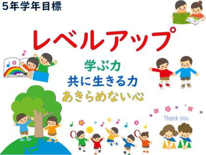 5年生の学年目標は,「レベルアップ 〜 学ぶ力・共に生きる力・あきらめない心〜」です。高学年となった子ども達。新しい教科や教科担任制、委員会など、様々なことが新しく始まります。そこで、3つの柱を立てて、1年間レベルアップして力を高めてほしいと思います。