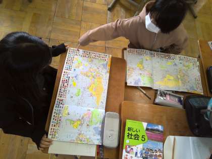社会科の学習で、日本の国土について学習を進めていきます。地球儀や地図を見て、気付いたことを話し合いました。これからの学習で、世界の大陸や海洋についてや日本の位置をどのように表すのかといったことを学びます。初めて世界地図を見たという人もいて、日本が意外と小さいことに驚いていました。