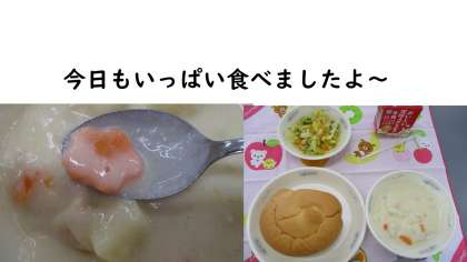 今日の献立は、バターうずまきパン・牛乳・じゃがいものクリームシチュー・ソテーです。シチューは春らしく、桜のにんじんの形に型抜きしてくださり、いくつか入っていましたよ。食後、「おいしかったよ〜〜〜」とたくさんの子が感想を聞かせてくれました。