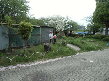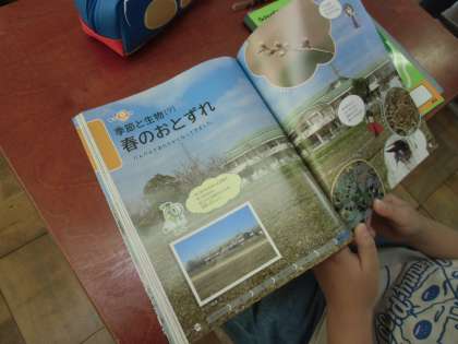 運動場に出て、これから1年間観察していく動植物を探しました。普段なかなかゆっくり草花を観察することが少ないかもしれませんが、今日はじっくり観察し、カエルやバッタを見つけている人もいました。1年間の学習が楽しみですね。