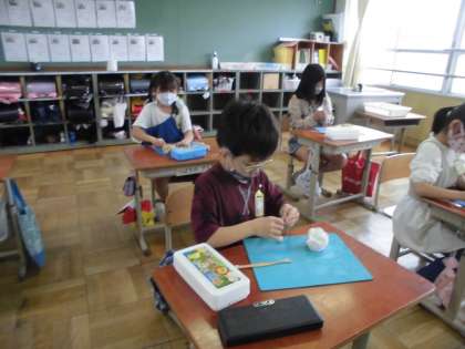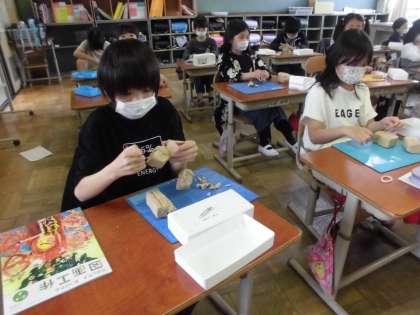 3年生初めての図工は、粘土を使った学習でした。糸やへらを使って粘土を切ったり、クリップなどでかき出したりしました。