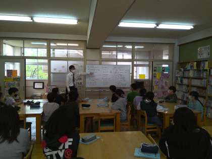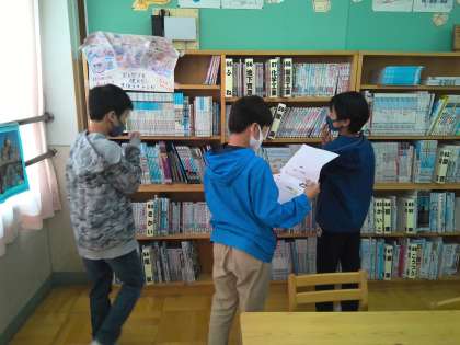 6年生になって初めて図書室に行きました。図書室での約束を確認した後、各グループで「配られたニュースについて調べるための本を見つける」という問題にチャレンジしました。本の探し方のコツがわかったので、これから各教科の調べ学習にも役立てていけると思います。